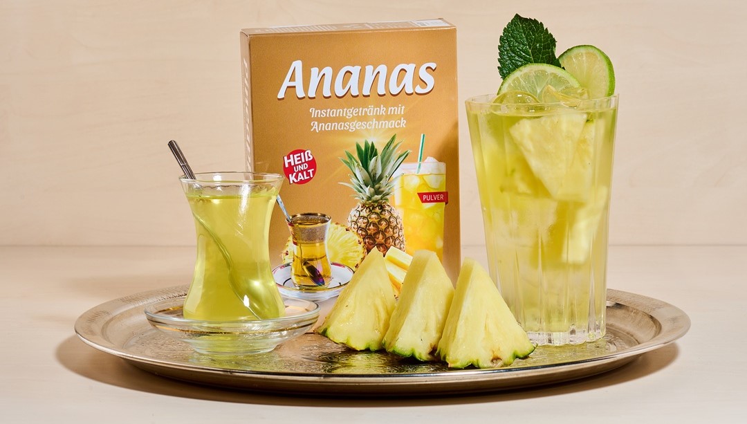 Ananastee 130 g Dieser erfrischende, leicht süßliche und exotische Tee ist perfekt geeignet für die warmen Sommermonate. Auch an kalten Tagen kann er als köstliche Alternative warm getrunken werden. Der Tee kann ohne großen Aufwand mit kaltem oder warmem Wasser zubereitet werden. Geben Sie dazu einen gehäuften Teelöffel in 150 ml Wasser. Weiterhin kann das Teepulver auch für die Herstellung von z. B. Fruchtschorlen, Cocktails, Kuchen, Marmeladen und Pudding und zum Verfeinern von Sekt benutzt werden.